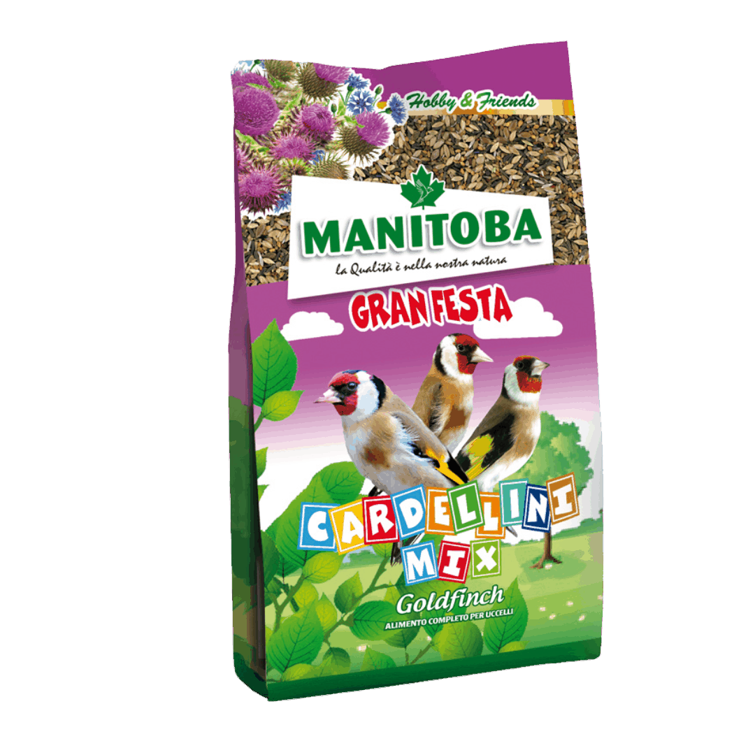 The Manitoba Gran Festa Cardellini Mix 500g provides a quality diet for the maintenance and breeding of finches, particularly goldfinches.