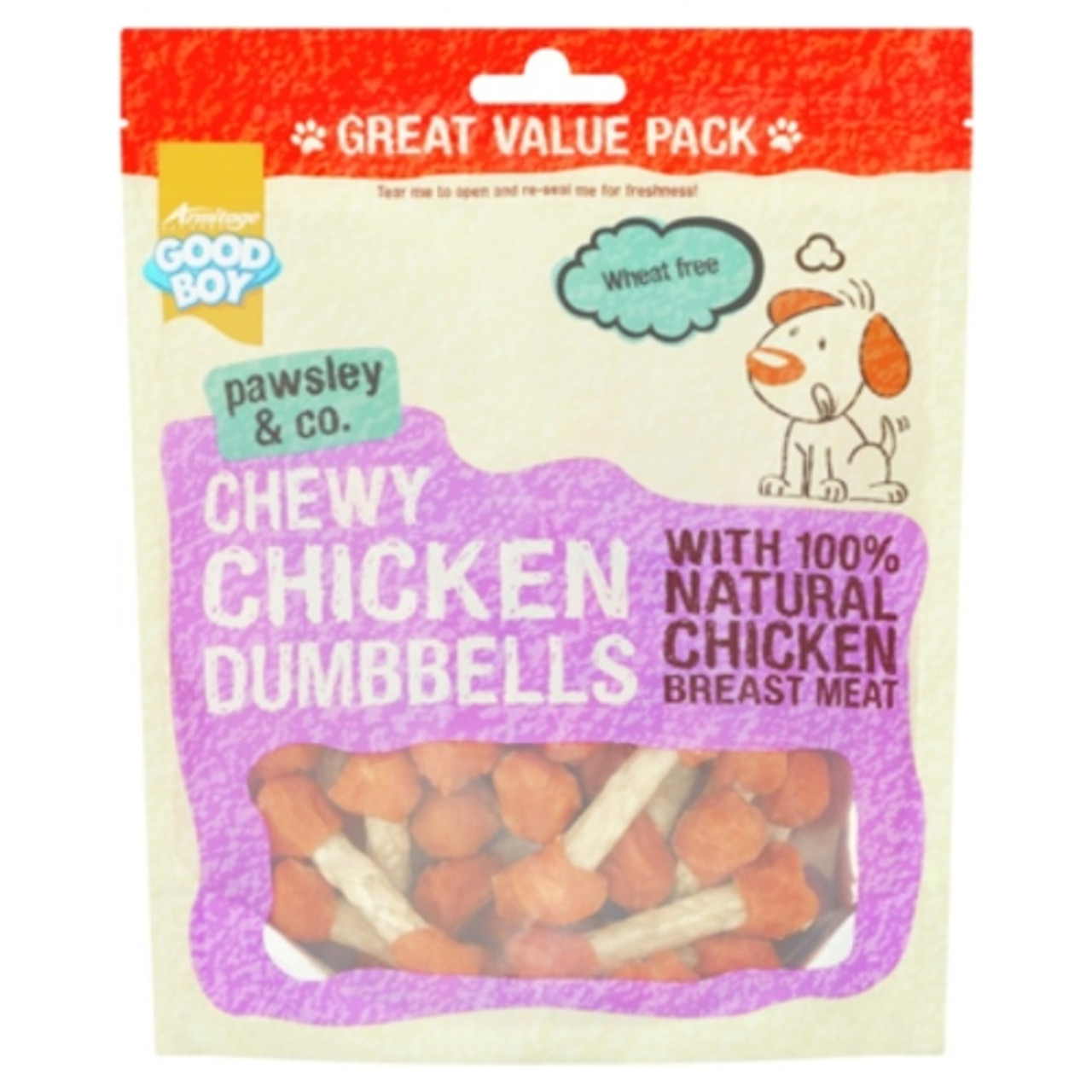 Good Boy Chewy Chicken Dumbbells are a delicious chewy treat made with 100% natural chicken breast meat. These delicious dumbbell treats are roasted in their own choices and are the perfect chicken treat to get your dog’s tail wagging.