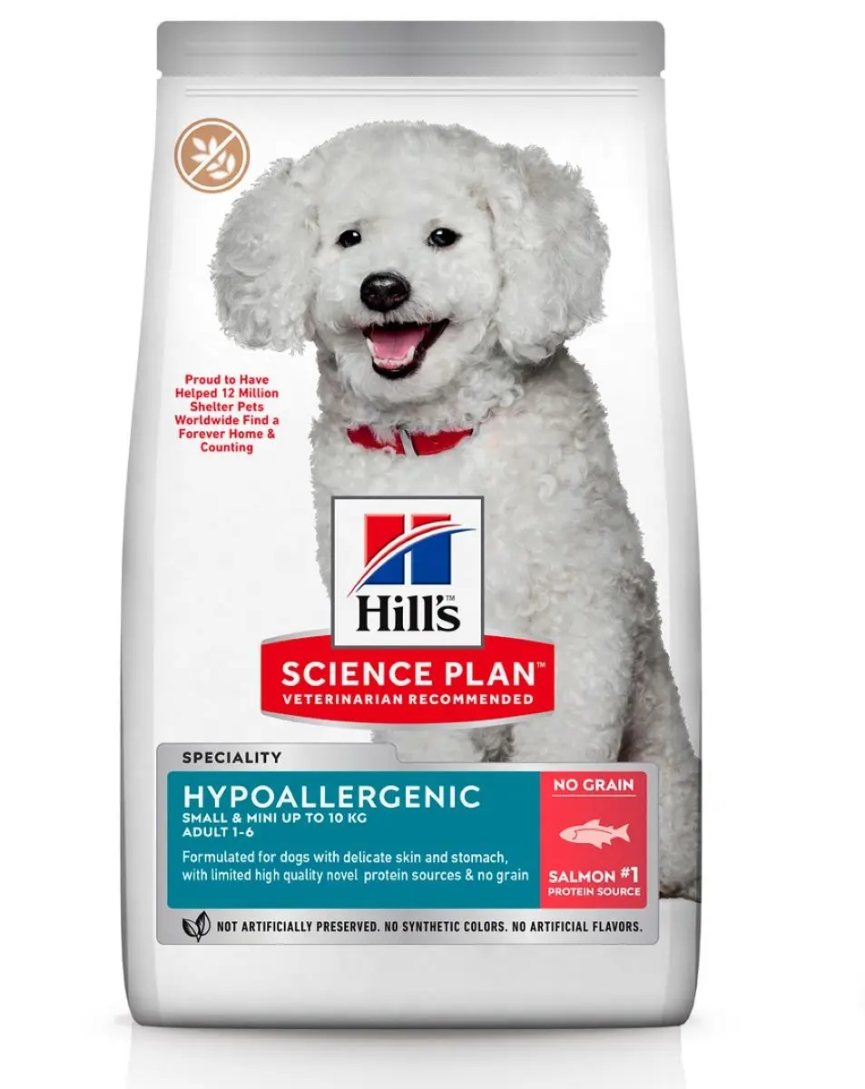 Give your small dog targeted nutrition with Hill’s Pet Nutrition Hill’s Science Plan Hypoallergenic Small & Mini Adult Dog Food with Salmon (1.5kg) — carefully developed for dogs aged 1–6 years with sensitive skin and digestive systems.